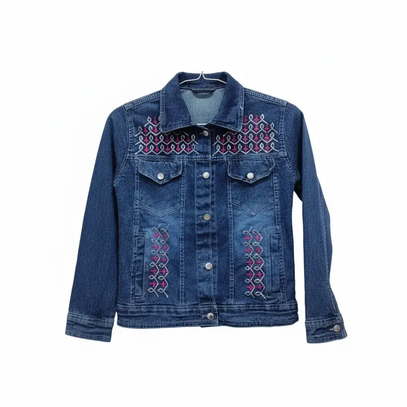 Elevate your casual style with this unique embroidered denim jacket for women. This classic blue jean jacket features intricate pink and white geometric embroidery on the shoulders and front panels. Made from a comfortable denim blend, it’s the perfect statement piece to add a touch of artistic flair to any outfit.